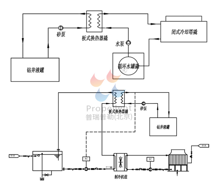 該系統(tǒng)提供兩種靈活的冷卻模式:一是通過(guò)空冷器利用自然風(fēng)冷卻循環(huán)水,再與鉆井液進(jìn)行熱交換;二是通過(guò)制冷機(jī)組制備冷凍水對(duì)鉆井液進(jìn)行強(qiáng)制降溫。
