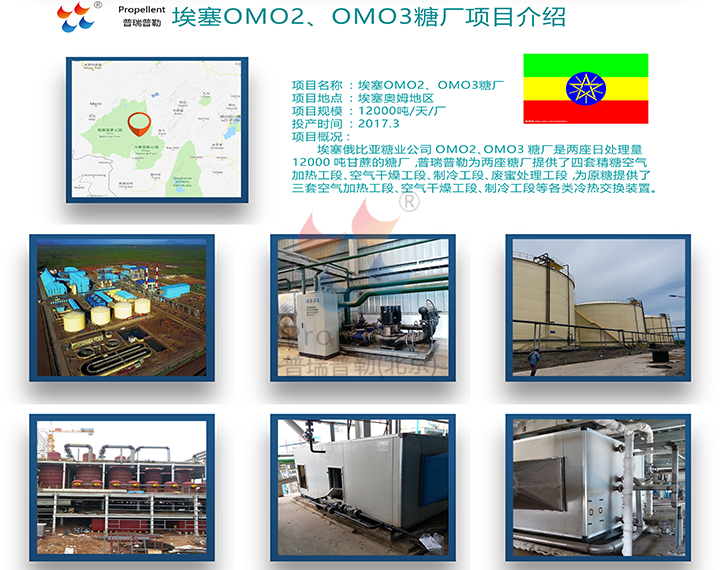 埃塞俄比亞糖業(yè)公司OMO2、OMO3糖廠是兩座日處理量12000噸甘蔗的糖廠,北京普瑞普勒為兩座糖廠提供了四套精糖空氣加熱工段、空氣干燥工段、制冷工段、廢蜜處理工段,為原糖提供了三套空氣加熱工段、空氣干燥工段、制冷工段等各類冷熱交換裝置。